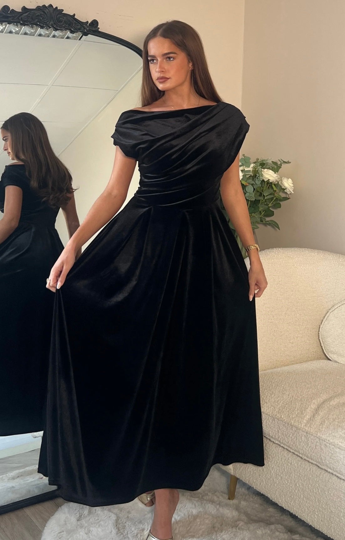 Betty Asymmetric Neckline Skater Midi Black Velvet