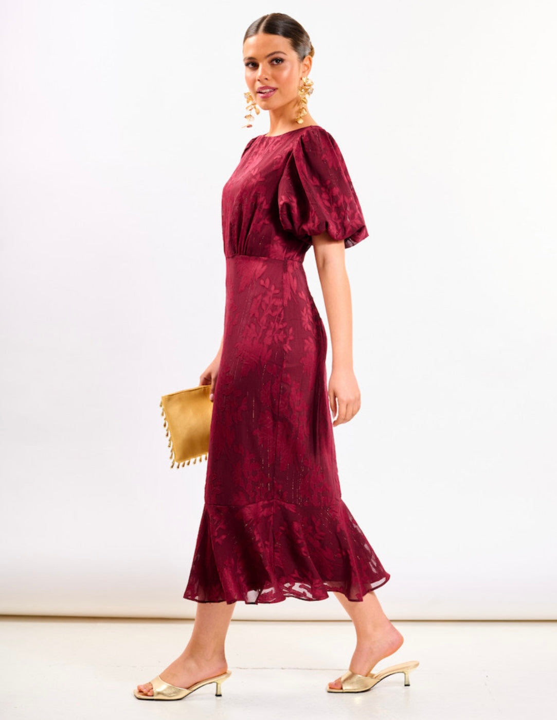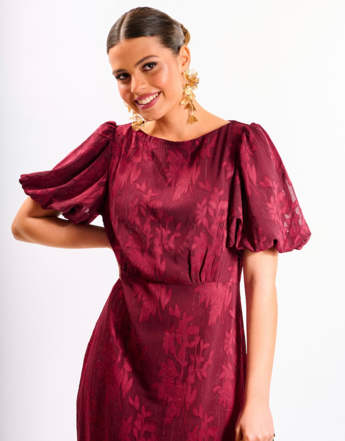 The perfect blend of effortless elegance, our beautifully detailed Puff Sleeve Midi Dress in a rich burgundy hue with a slight shimmer of silver lurex. Designed for, Autumn weddings, parties and or any special daytime occasion. it blends romantic charm with a refined silhouette.