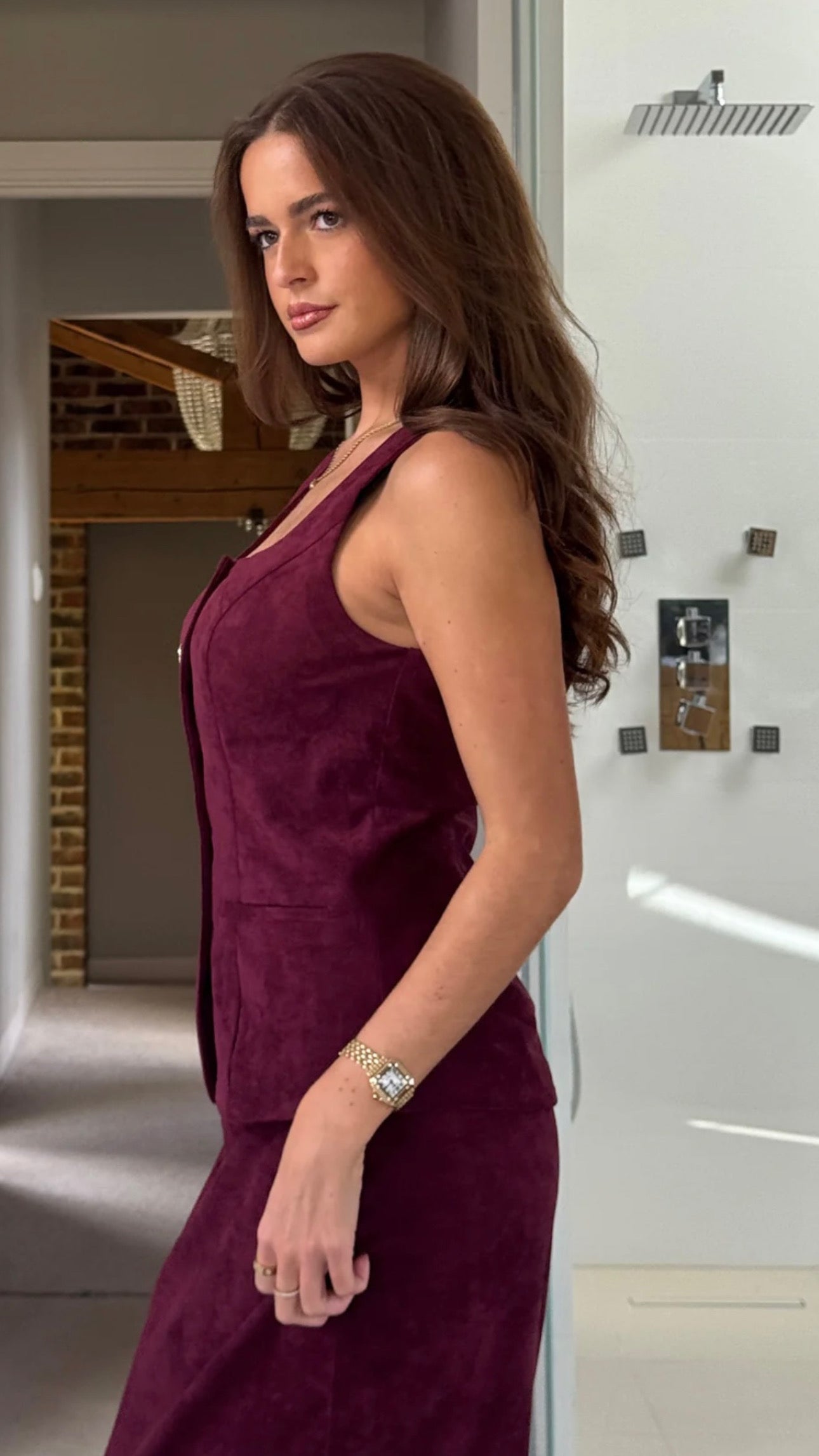 Berry Suede Waistcoat With Gold Button Appliqué