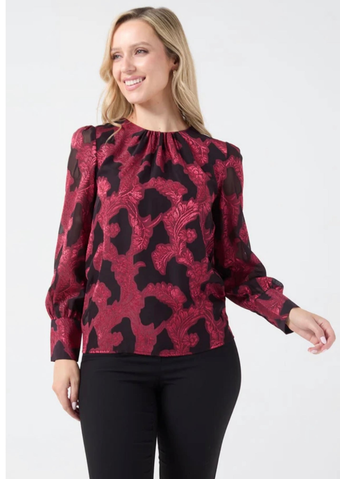 Red Baroque Print Blouse! This chic and playful blouse features flutter sleeves and a scoop hem for a unique and stylish look. This blouse is both fashionable and functional. Perfect for any occasion, this blouse is sure to make a statement.