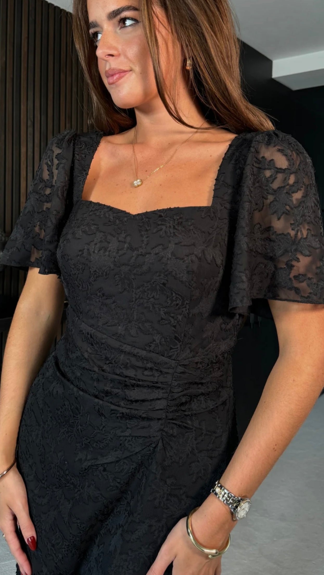 Heidi Ruched Midi Dress is the perfect addition to your wardrobe. Featuring an elegant sweetheart neckline, figure flattering ruching detail that accentuates your waist, and delicate frills on the skirt, this dress is sure to make a statement. Made with a luxurious burnout fabric, look chic with effortless elegance. Pair with heels and minimal jewelry.