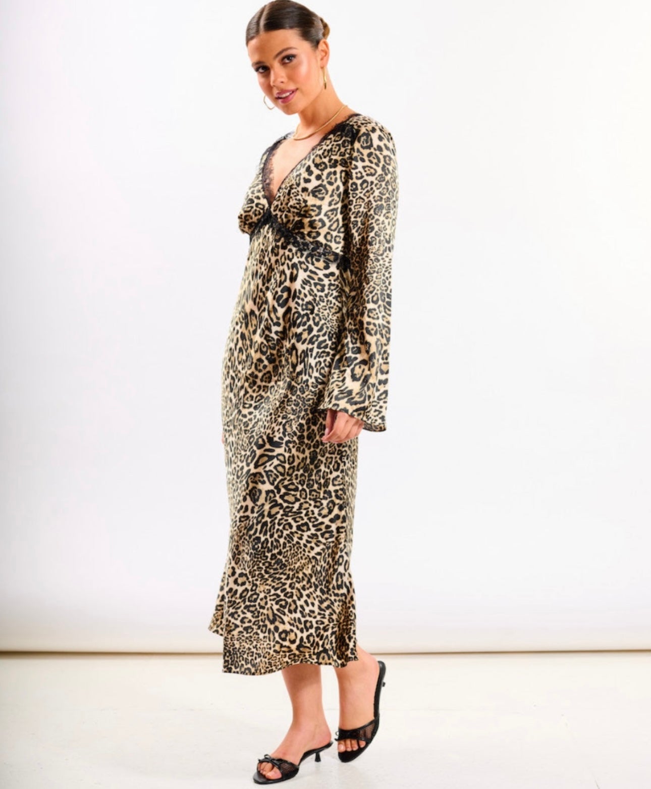 Fierce meets feminine in this sultry lace trim leopard midi dress. Designed with a bold animal print and delicate black lace detailing, it’s the perfect blend of wild and romantic. The deep V-neckline and long sleeves offer an elegant silhouette, while the midi length keeps the look polished yet playful.